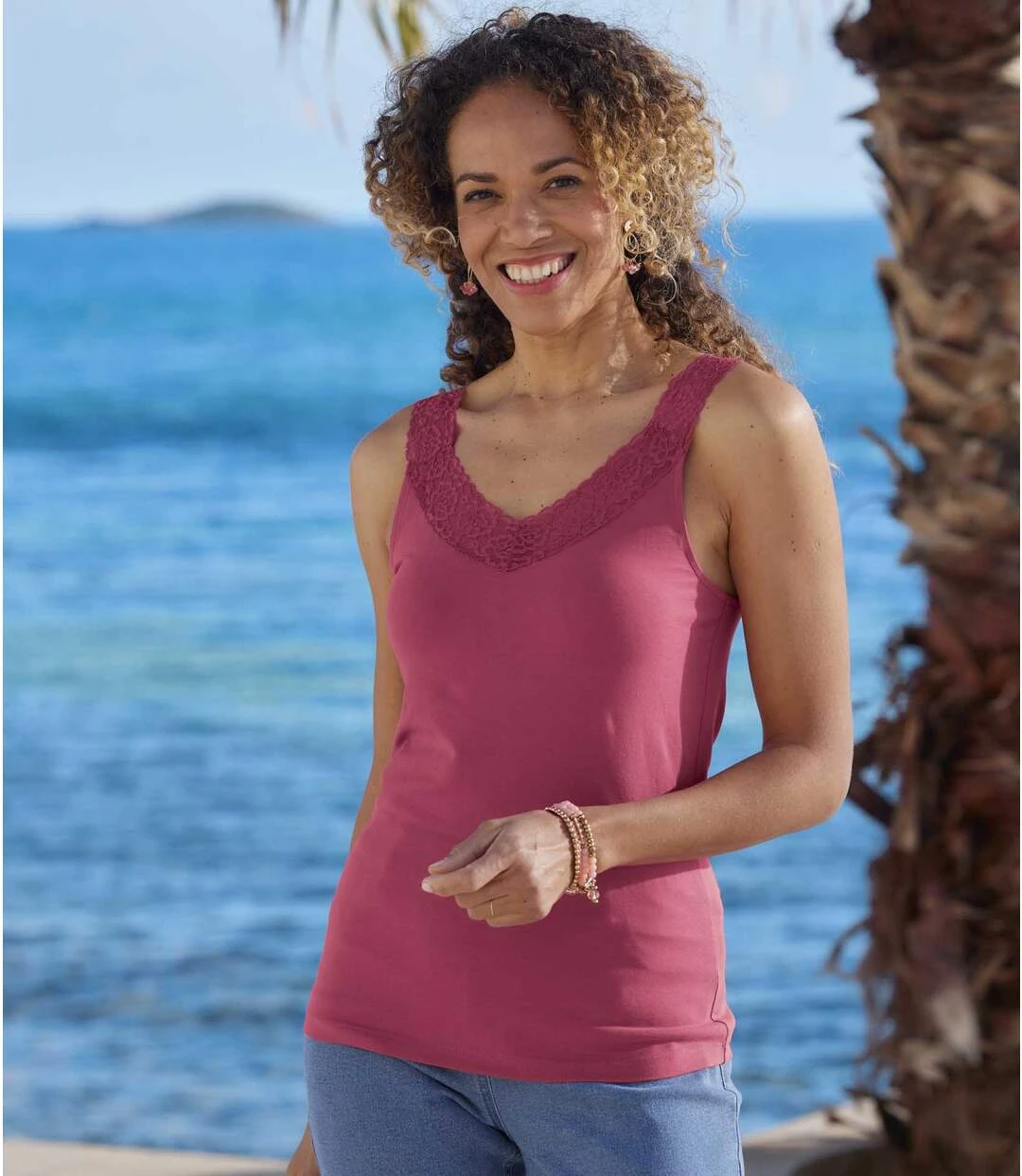These comfortable and feminine tank tops are made from soft stretchy cotton (approx. 160 g/m²), and feature slightly stretchy tone-on-tone lace on the front neckline and straps. Hem with a double topstitched finish. 95% cotton, 5% elastane. Lace: 90% polyamide, 10% elastane. Back length: approx. 24.8 in/63 cm for CA size 8-10. Machine wash at 30°C. Colour: pink and off-white / Ref.: ZP618