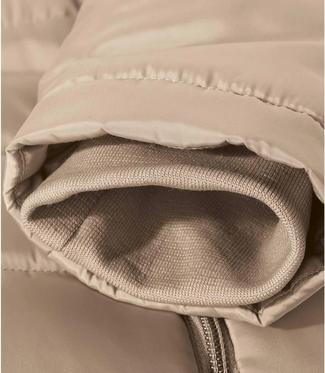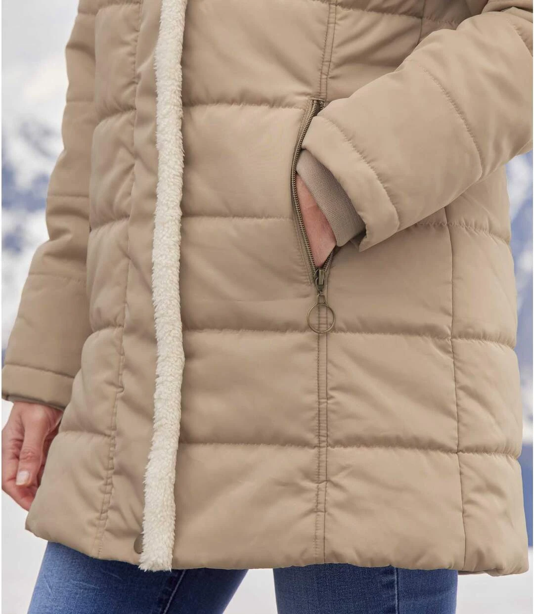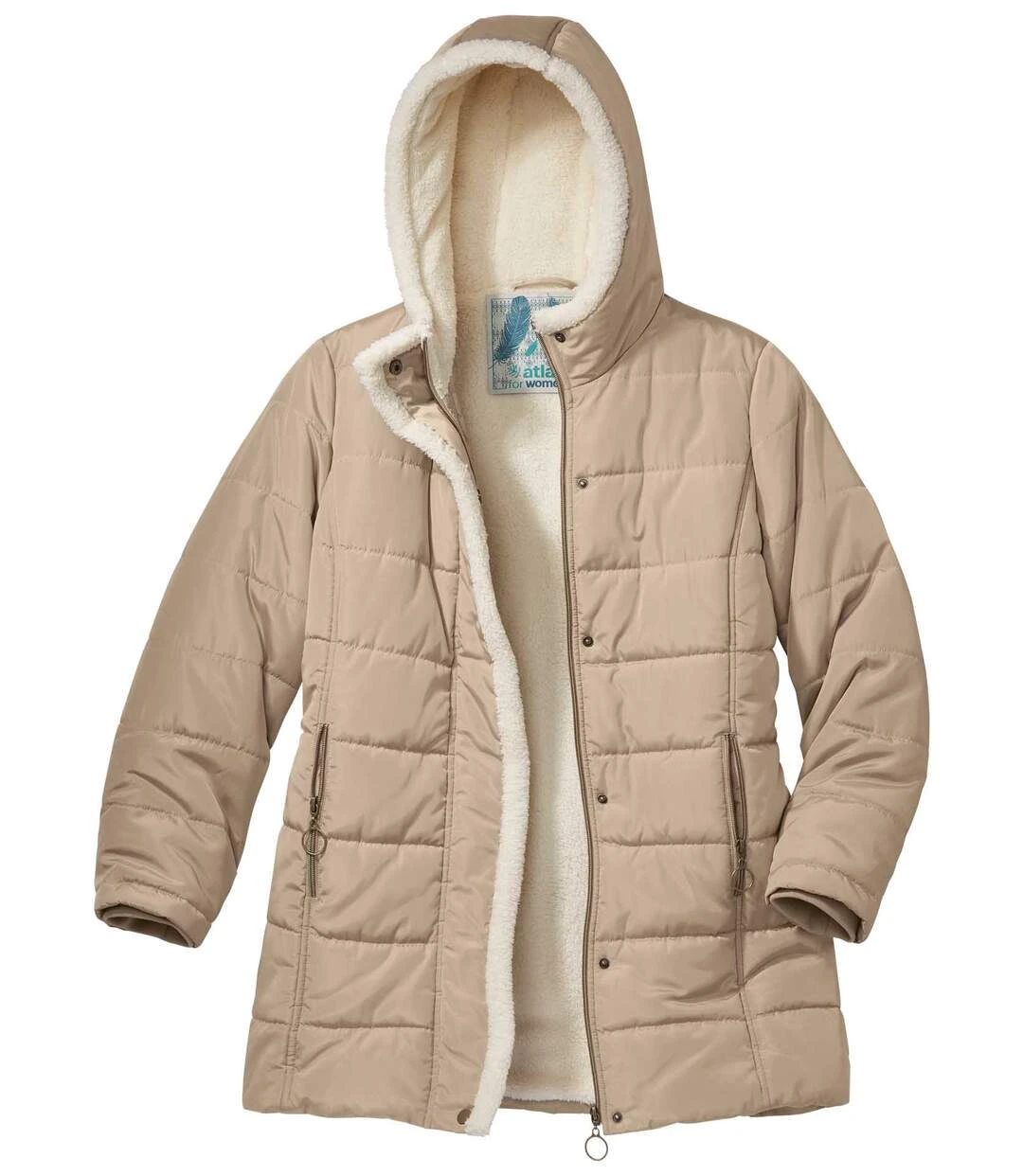 This winter warmer is guaranteed to protect you from all weather! Made from water-repellent microfibre, it is fully lined with warm fleece (approx. 420 g/m²) and has a practical foldaway hood too. Well insulated, it features a zip-up fastening under a press-stud placket along with ribbed cuffs that keep out the cold air. You’ll love the practical zip pockets set in the figure-flattering princess panels. Horizontal quilting and gold-coloured metal finishes. This coat will keep you well covered and ultra-cozy! 100% polyester. Total length: approx. 28 in/84 cm for size 8-10. Machine wash at 30°C. Colour: beige – Ref: ZN022