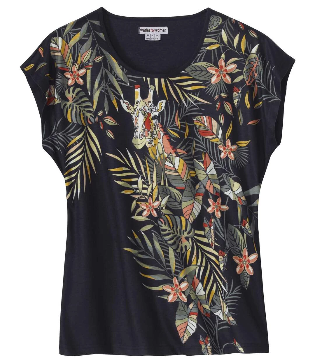 Opt for this original and easy-to-wear t-shirt with slouch shoulders! Made from flowy fabric (approx. 160 g/m²), it features an exclusive print on the front and a trimmed round neckline. Armholes and a straight hem with double topstitched finishes. Plain back. 100% polyester, cotton feel. Front and back length: approx. 27.2 in/69 cm for CA size 8-10. Machine wash at 30°C. No ironing required. Colour: black with multicoloured patterns – Ref.: ZQ704