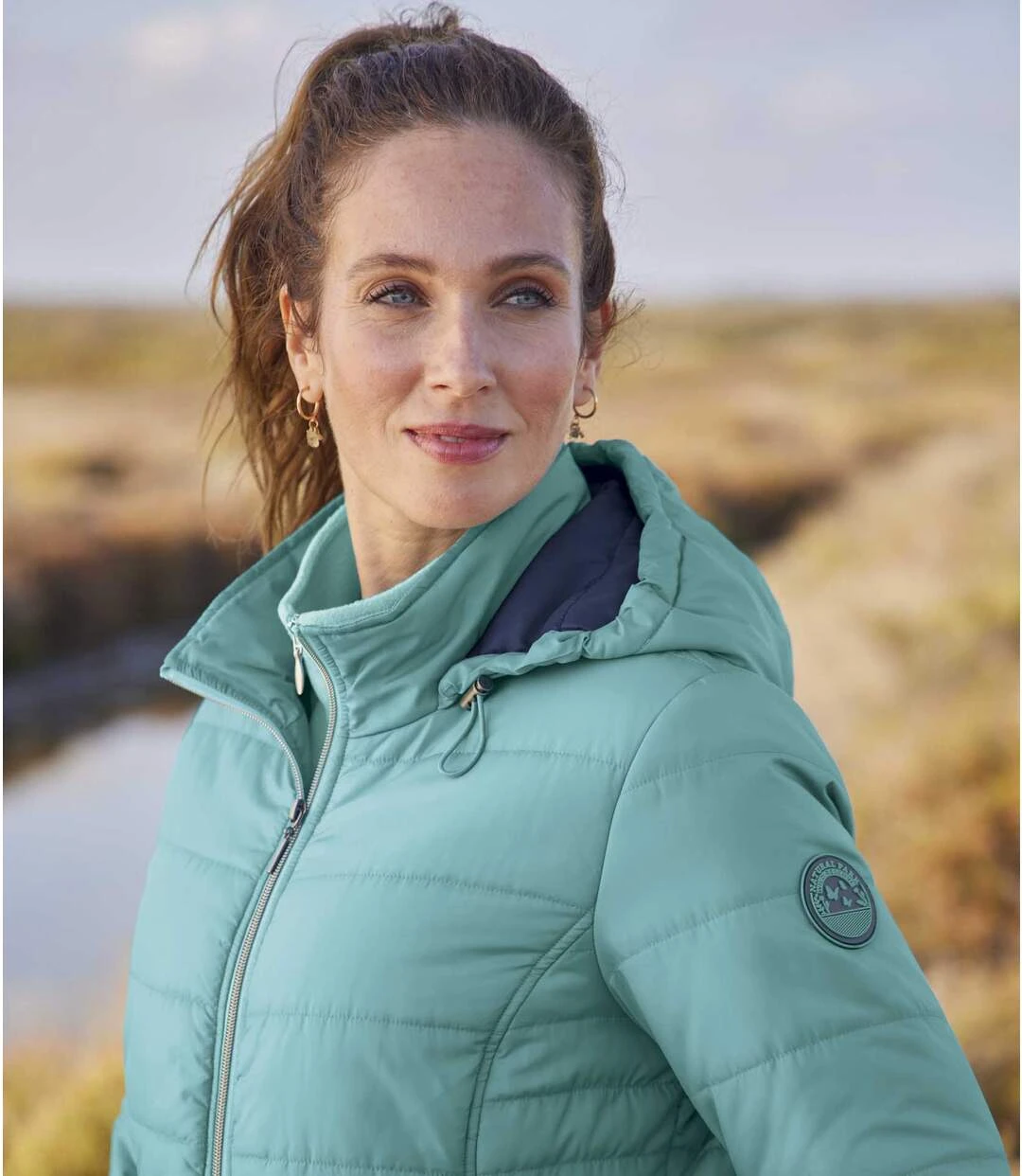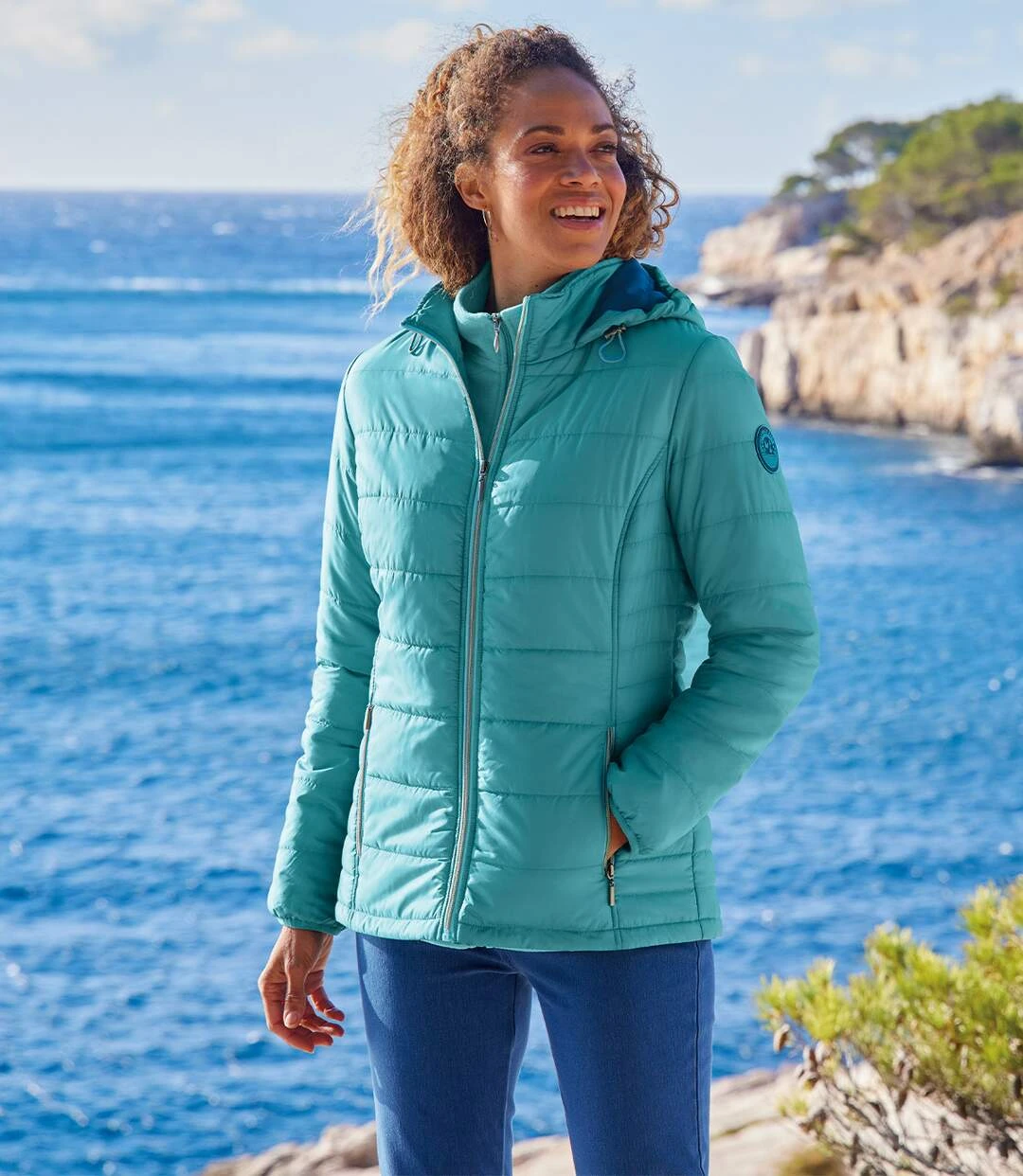 Looking for a lightweight and practical padded jacket for between seasons? Choose this water-repellent zip-up design in a trendy iridescent colour. Warmly quilted (approx. 280 g/m²), it features an adjustable drawstring hood and 2 zip-up pockets. Quality finishing touches include figure-flattering horizontal quilting and princess panels at the sides, an elasticated trim on the cuffs, a rubber crest on the left sleeve and a contrasting lining. 100% polyester. Back length: approx. 28 in/71 cm for CA size 8-10. Machine wash at 30°C. Colour: blue / Ref.: ZQ008