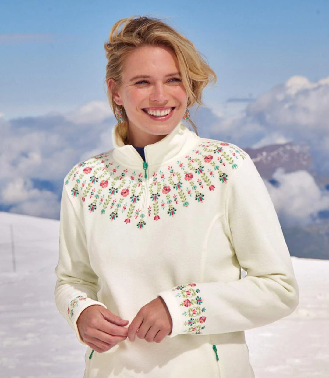 This original and feminine pullover in soft, warm microfleece (approx. 190 g/m²) features stylish floral patterns around the neckline and cuffs! It has a zip-up funnel neck and 2 zip-up pockets in the seams of the princess panels. Long sleeves and a straight hem with double topstitched finishes. Plain back. Contrasting zip pulls. 100% polyester. Front and back length: approx. 27.6 in/70 cm for CA size 8-10. Machine wash at 30°C. Quick dry. Colour: ecru – Ref.: ZR401