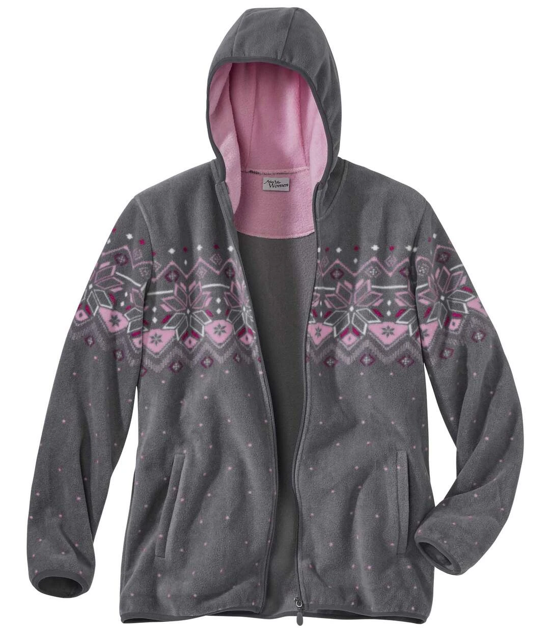 You’ll absolutely love this classic winter jacket with its gorgeous jacquard print and warm polar fleece material (approx. 320 g/m²). It’s irresistibly soft and, thanks to its slightly cinched waist, has a real feminine look. It’s super-warm and the microfleece lining in the hood will further insulate you from the cold. 2 side pockets. Elasticated cuffs, hem and hood. Fleece: 100% polyester. Back length: approx. 27.2 in/69 cm for CA size 8-10. Machine wash at 30°C. Colour: grey, pink details – Ref: ZG119