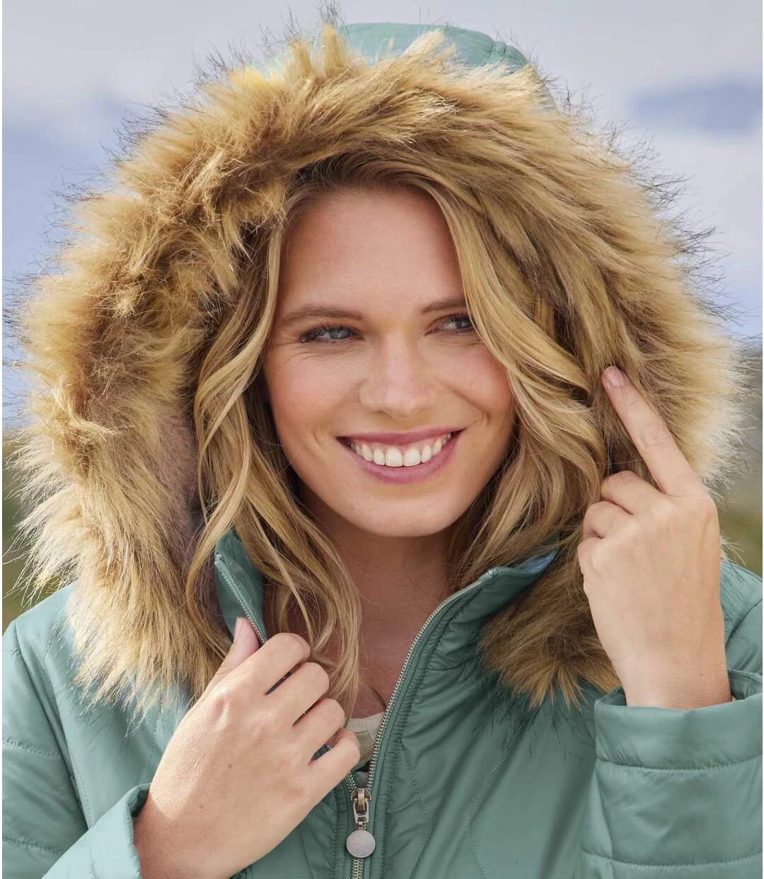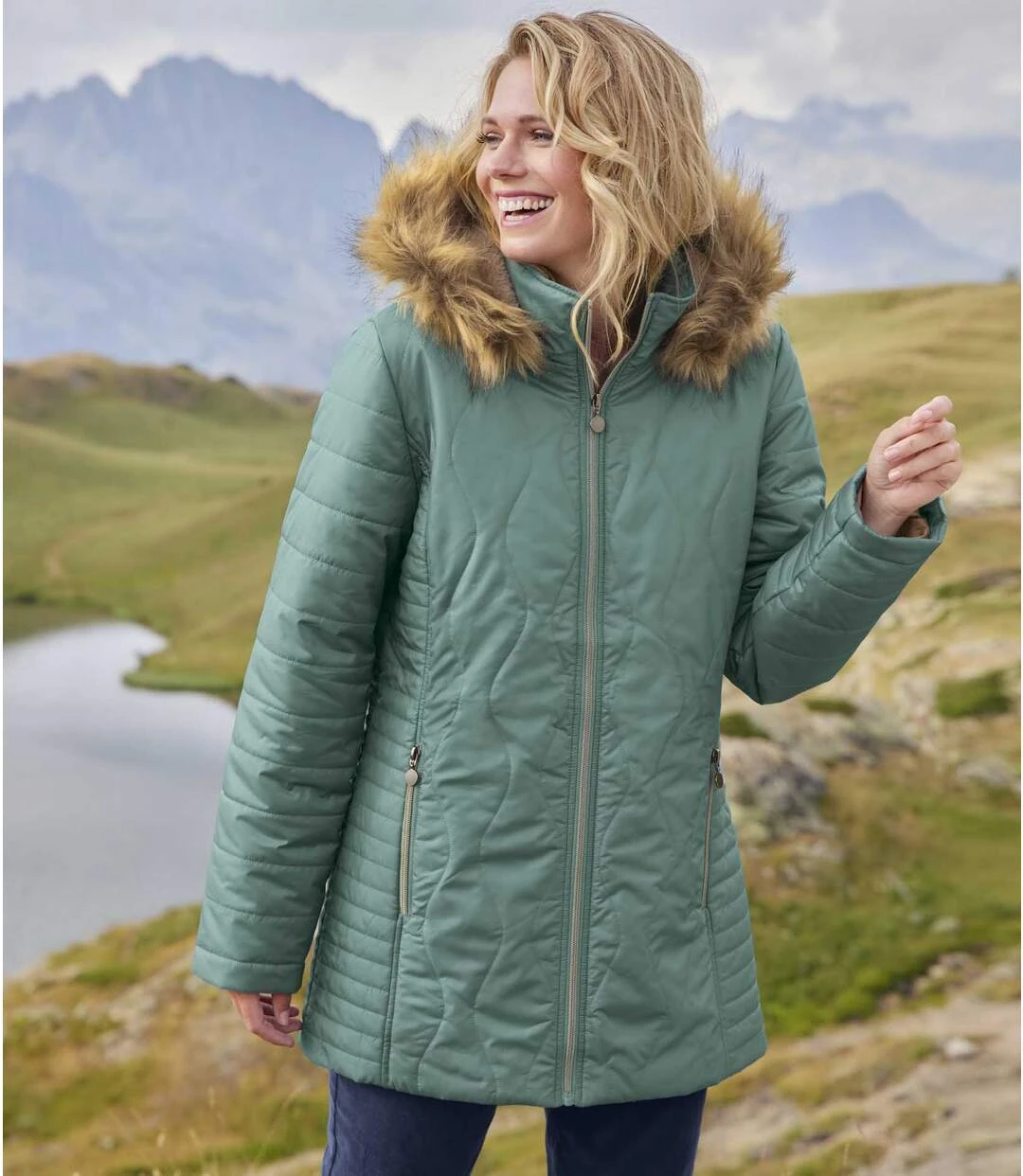 Stay in style with this original and feminine zip-up padded jacket that comes in a subtle colour. It is water-repellent and warmly padded (approx. 370 g/m²) to protect you from the elements. Top-quality finishing touches include decorative quilting, a hood lined and trimmed with warm faux-fur, and 2 zip-up side pockets. Silver-coloured metal zips. Body: 100% polyester. Hood: 55% acrylic, 45% polyester. Front and back length: approx. 31.9 in/81 cm for CA size 8-10. Machine wash at 30°C. Colour: green – Ref.: ZR415