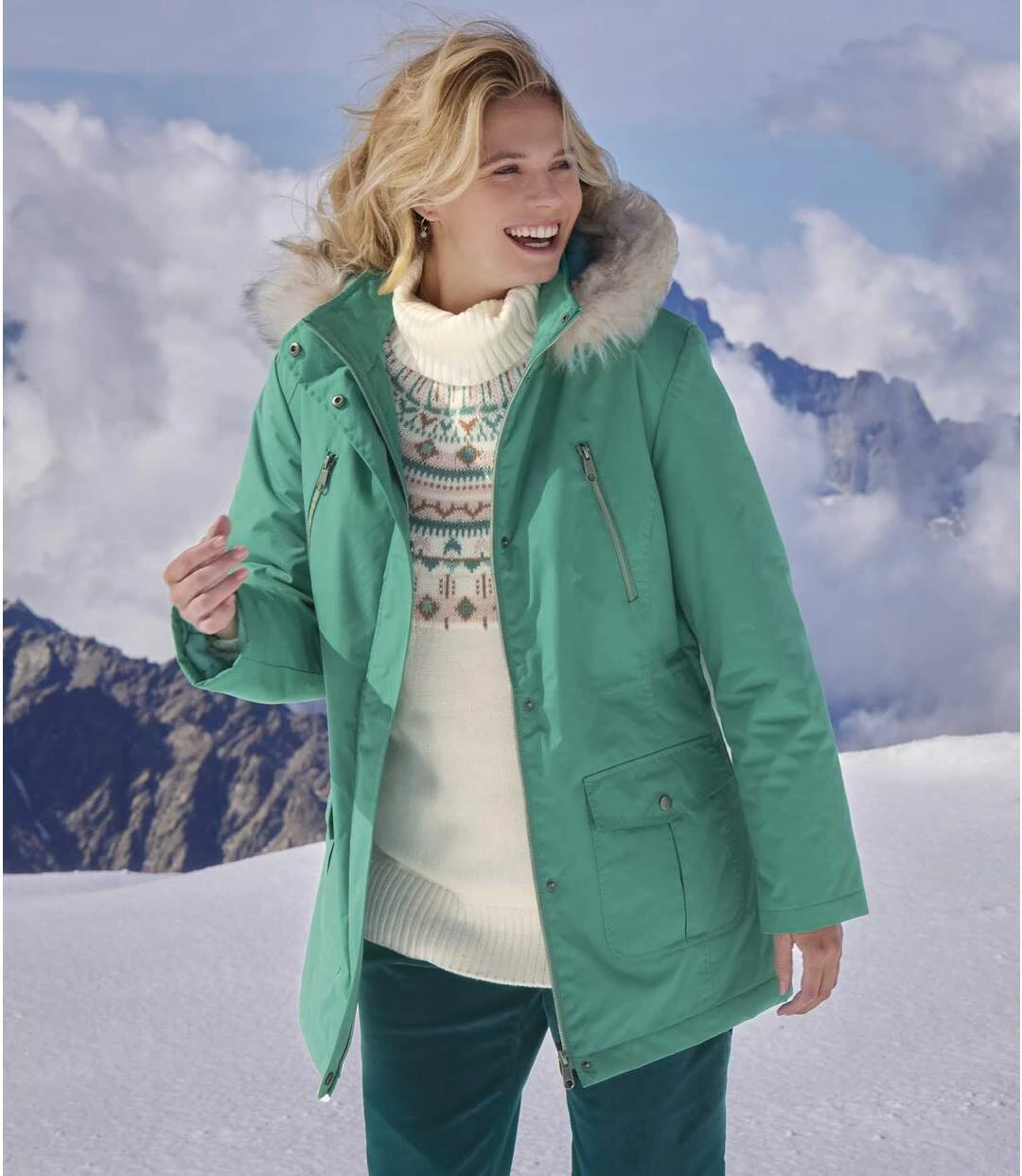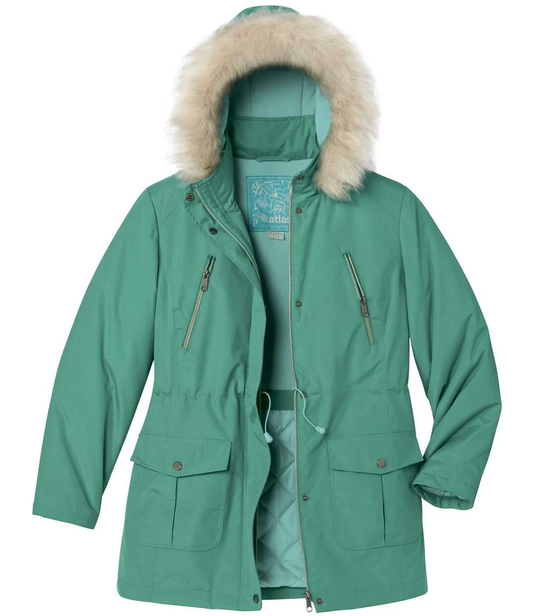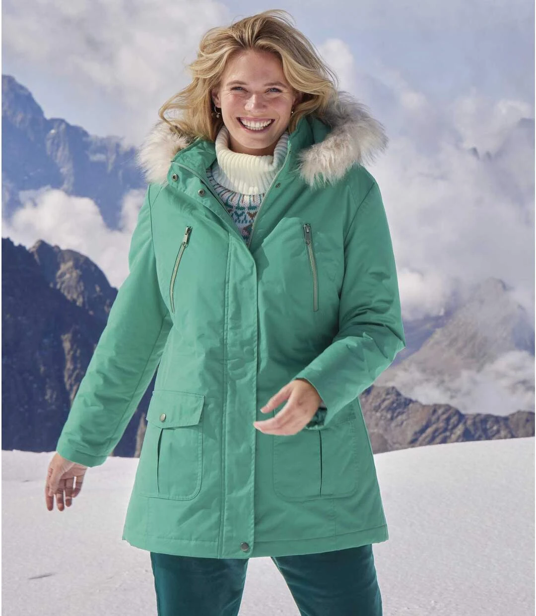 This winter, choose this warm and feminine parka! It is made from water-repellent microtech fabric (approx. 220 g/m²), which has been fully padded and lined with fleece at the top (approx. 290 g/m²) and quilting at the bottom (approx. 210 g/m²). The practical yet trendy design includes a warm hood trimmed with stylish faux fur, and a zip fastening under a press-stud placket. 4 handy pockets: 2 zip-up pockets at the chest and 2 pockets with press-stud flaps at the sides. Quality finishes include an adjustable drawstring waistline and silver-coloured zips and press-studs. A figure-flattering design to add to your winter wardrobe! 100% polyester. Front and back length: approx. 26.8 in/81 cm for CA size 8-10. Machine wash at 30°C. Colour: green – Ref.: ZR303