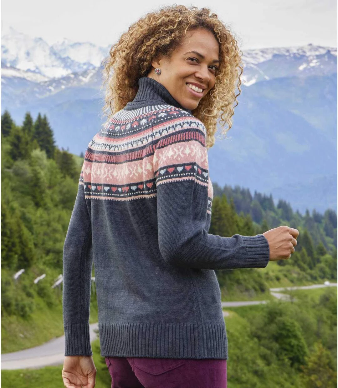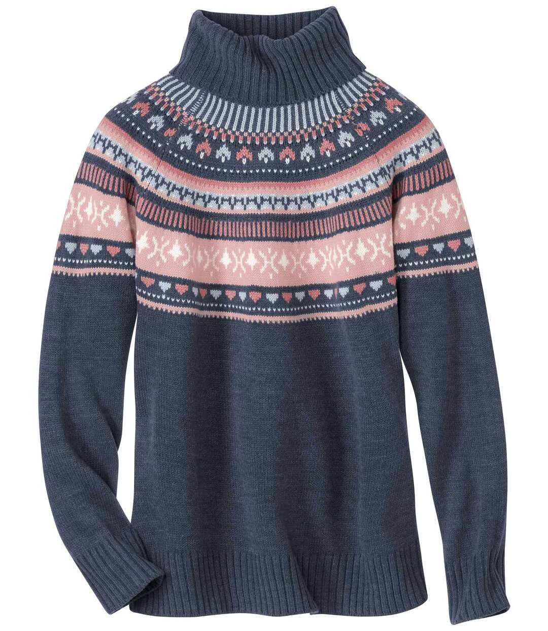 Be prepared for cold weather in this elegant knitted sweater with a festive pattern around the shoulders (front and back)! Both soft and cozy, it features raglan sleeves, plus a ribbed roll-neck, cuffs and hem for extra warmth. A stylish and easy-care design! 100% acrylic. Back length: approx. 27 in/68 cm for CA size 8-10. Machine wash at 30°C. Colour: blue and pink patterns / Ref.: ZP601
