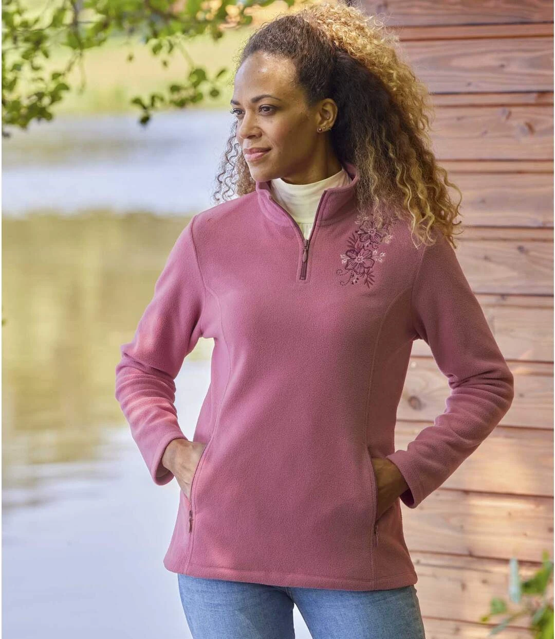 This super-practical pullover is made from lightweight, soft and warm microfleece (approx. 190 g/m²)! It features a protective zip-up funnel neck, 2 zip-up pockets at the sides and a pretty floral embroidery on the left shoulder. Long sleeves and a straight hem with double topstitched finishes. 100% polyester. Front and back length: approx. 28.7 in/70 cm for CA size 8-10. Machine wash at 30°C. Quick dry. No ironing required. Colour: pink – Ref.: ZR311