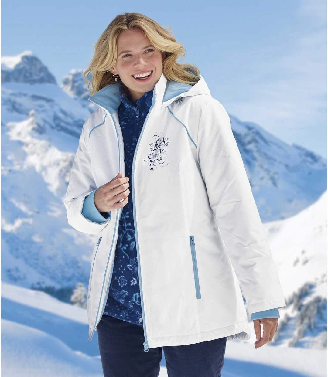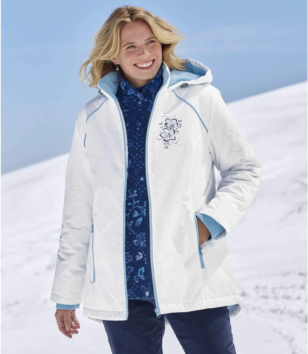 This comfortable jacket is perfect for hitting the slopes! Made from warmly padded water-repellent microtech canvas, it is lined with fleece on the body (approx. 530 g/m²) and taffeta at the sleeves. Super-insulating, it will keep the cold at bay thanks to the zip-up fastening, funnel neck, fleece-lined hood, and ribbed inner cuffs. Quality finishes include 2 handy zip-up pockets, contrasting blue details (piping along the shoulder panels and zips), and a floral print. Straight hem at the front, slightly longer and rounded at the back. 100% polyester. Front and back length: approx. 30.3-31.9 in/77-81 cm for CA size 8-10. Machine wash at 30°C. Colour: white – Ref.: ZR411